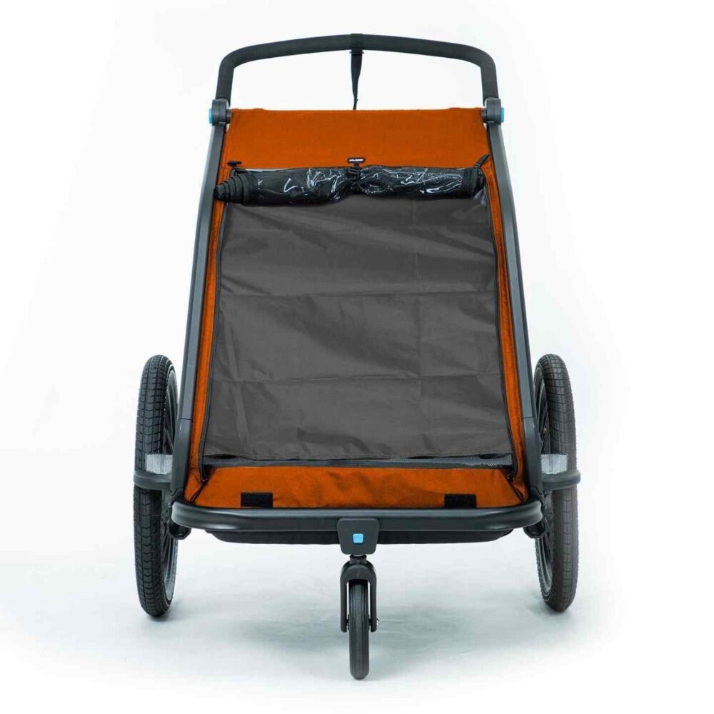 Cette remorque se transforme facilement en poussette grâce à son kit de conversion optionnel. Le système d’attache universel permet une fixation rapide sur la plupart des vélos. Un grand coffre de rangement offre un espace supplémentaire pour les affaires des enfants. Les roues amovibles simplifient l’entretien et le nettoyage. Enfin, le pare-soleil intégré protège les petits des rayons UV.