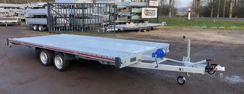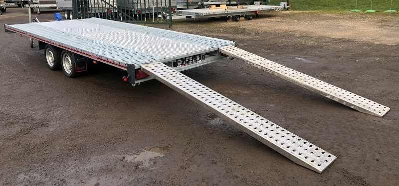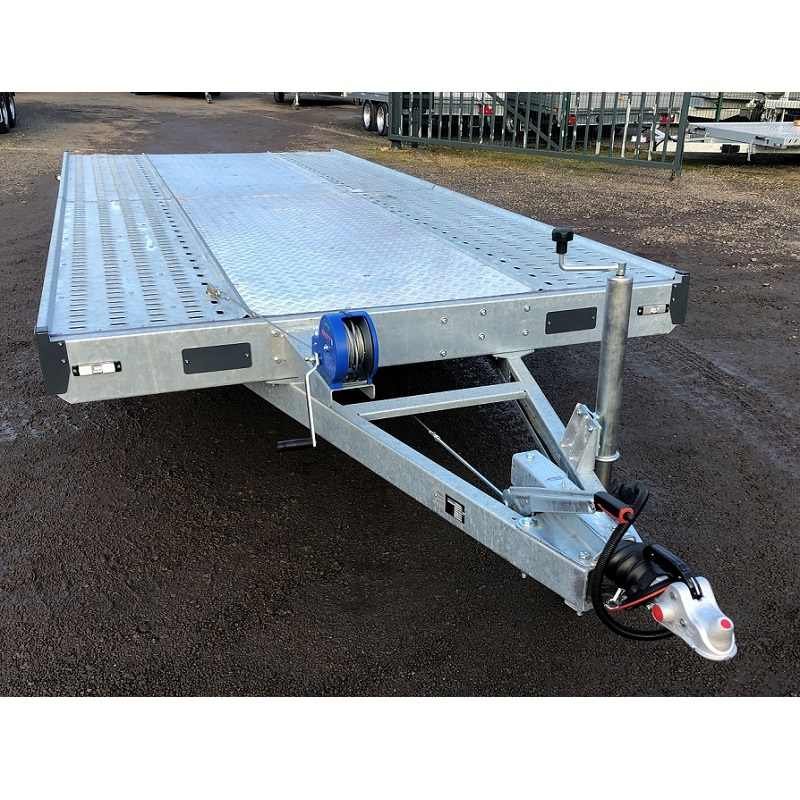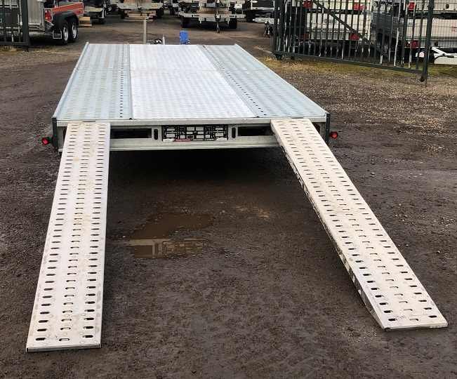 La plateforme de transport est en acier avec une surface antidérapante, assurant la sécurité lors du chargement et du déchargement des véhicules. Les rampes en aluminium de 2,5 mètres facilitent l’accès à la plateforme. Les dimensions généreuses de la plateforme permettent de transporter une large gamme de véhicules.