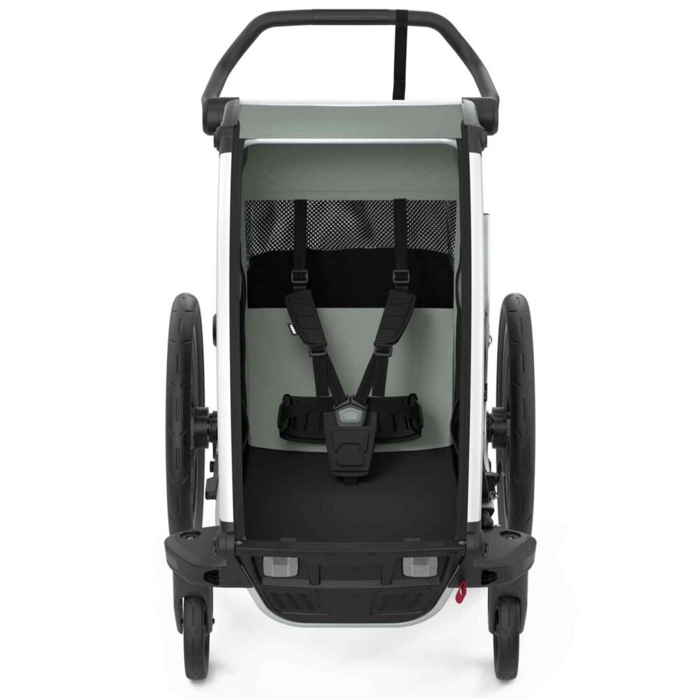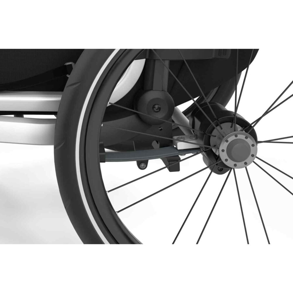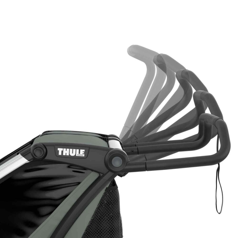 Thule intègre des normes de sécurité strictes dans cette remorque. La structure rigide et le harnais 5 points garantissent une stabilité parfaite. Les ceintures réglables et les matériaux résistants protègent l’enfant contre les chocs. De plus, la remorque dispose d’un arceau de sécurité et d’un drapeau fluorescent pour une meilleure visibilité.